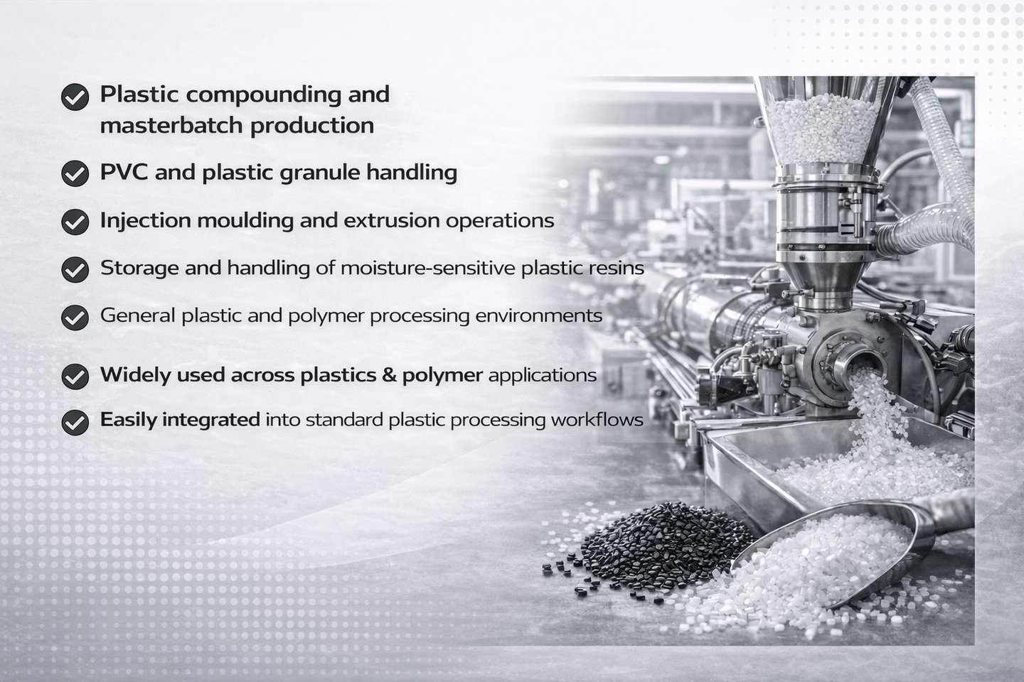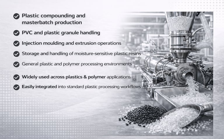 Reliable anti-moisture solutions for plastic processing and industrial applications. Used by plastic processors and compounders across Delhi NCR.